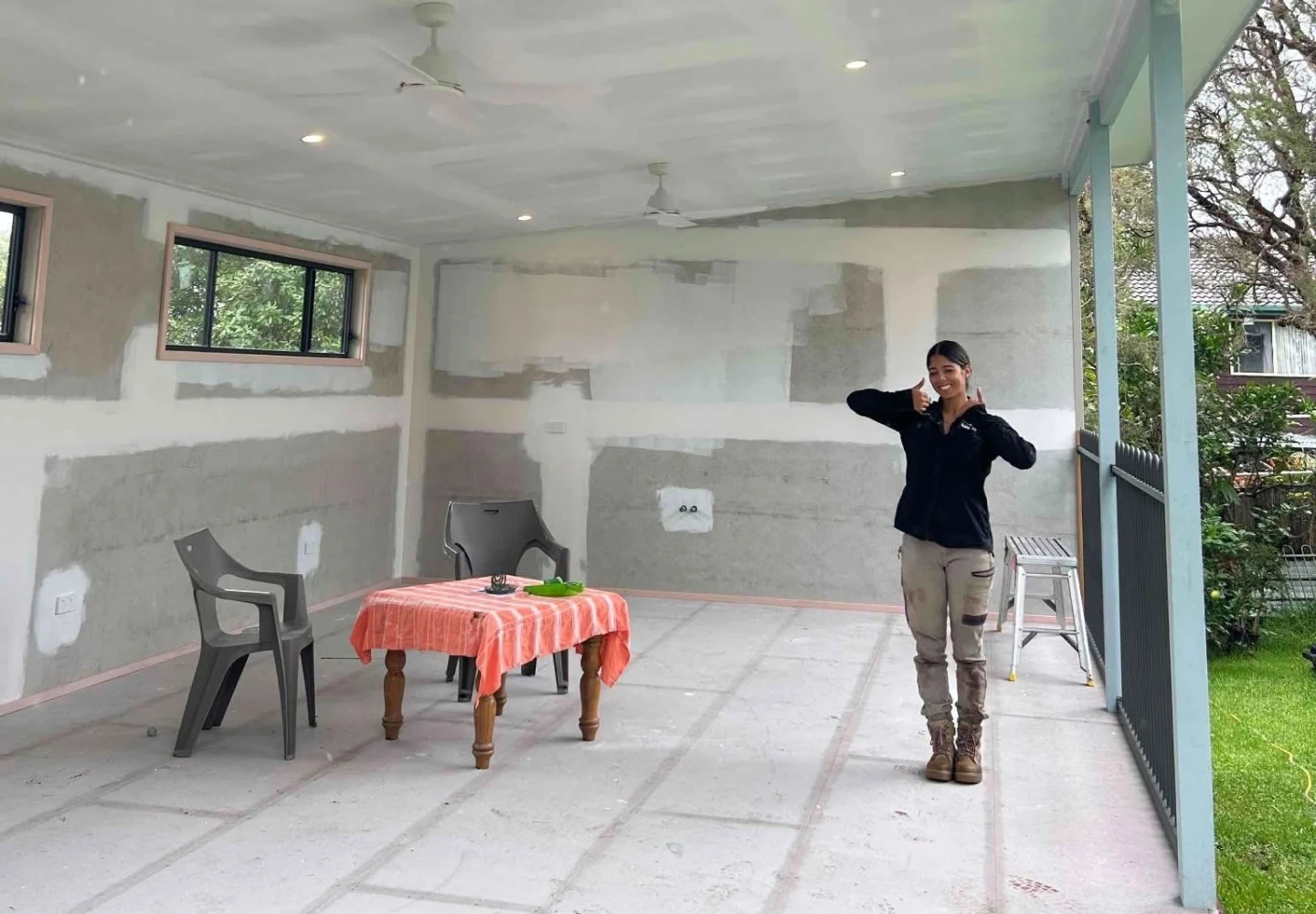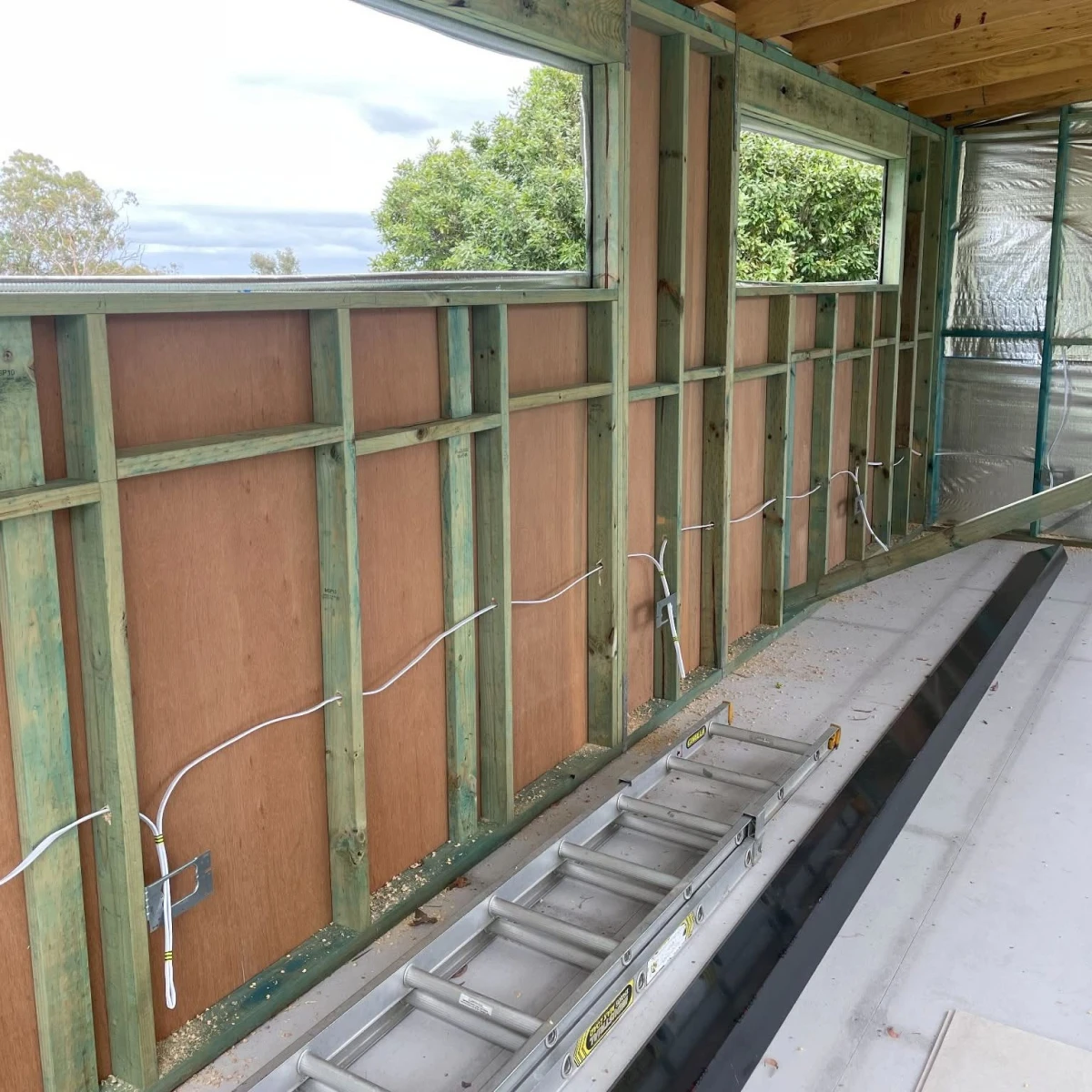 On our first visit, we carried out the rough-in phase, running all necessary cabling for lighting, ceiling fans, and power outlets before the plasterboard installation.